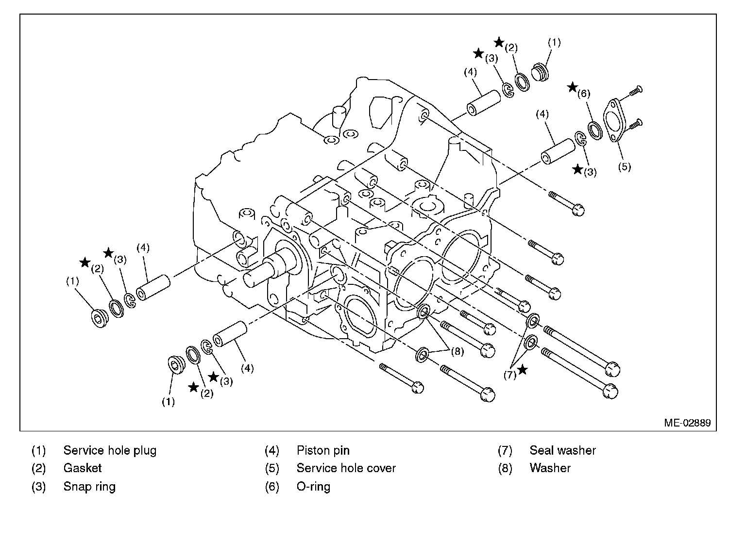 27) Rotate the crankshaft to bring #1 and #2 pistons to bottom dead center position, then remove the piston snap ring through service hole of #1 and #2 cylinders.