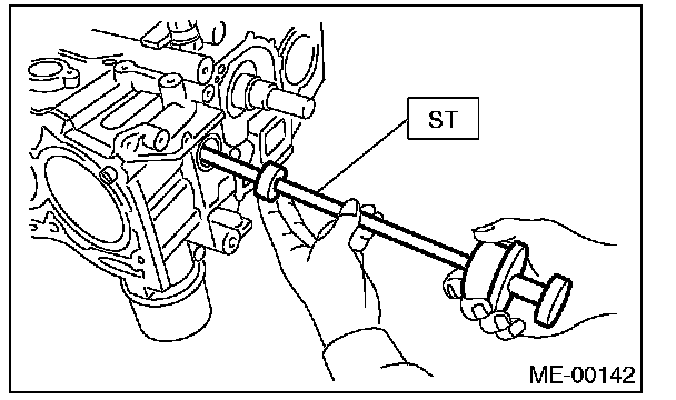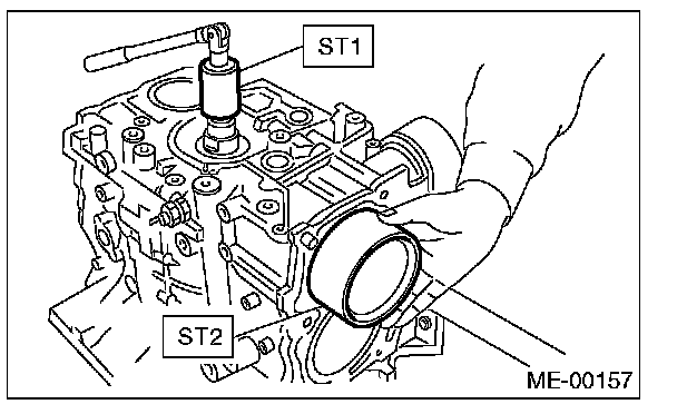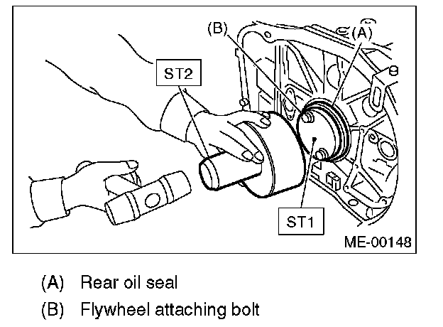 12) Apply a coat of engine oil to the oil seal periphery, then install the rear oil seal using ST1 and ST2.