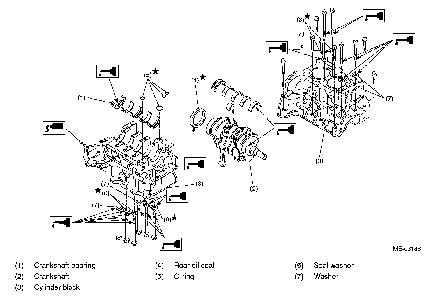 1) Remove oil on the mating surface of cylinder block before installation. Apply a coat of engine oil to the bearing and crankshaft journal.