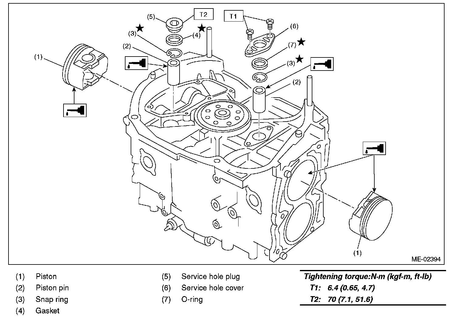 1) Check the piston and piston pin for breaks, cracks or wear. Replace if faulty.