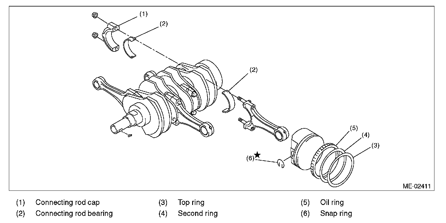 5) Check the piston pin snap ring for distortion, cracks and wear.