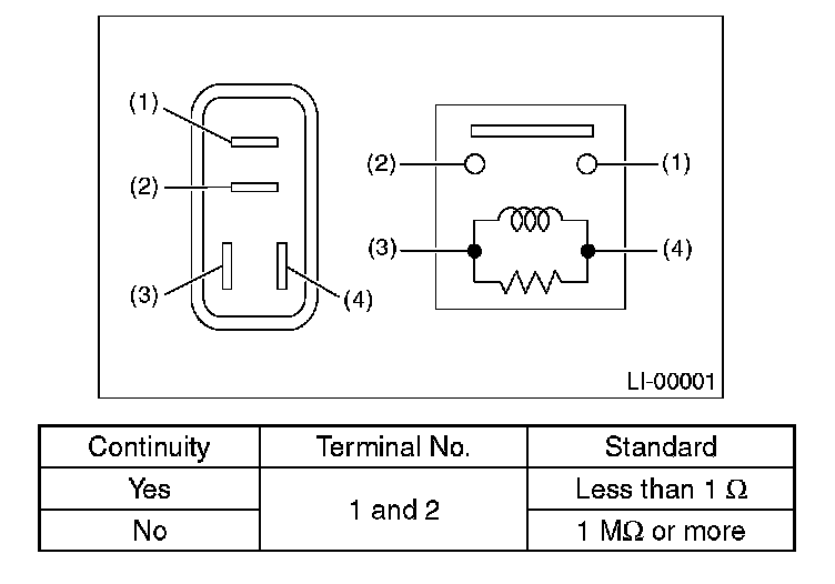 2. FRONT FOG LIGHT RELAY Connect terminal No. 4 to battery positive terminal and terminal No. 3 to battery ground terminal, and measure the front fog light relay resistance between terminals.