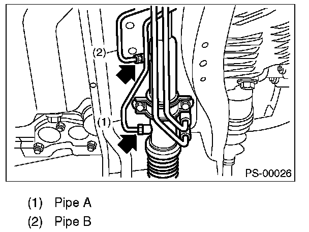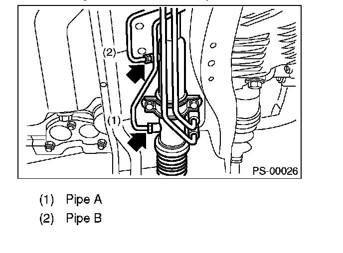 3) Remove the one pipe joint at the center of gearbox assembly, and connect a vinyl hose to the pipe and the joint. Discharge the fluid by turning the steering wheel fully clockwise and counterclockwise. Discharge the fluid similarly from other pipes.