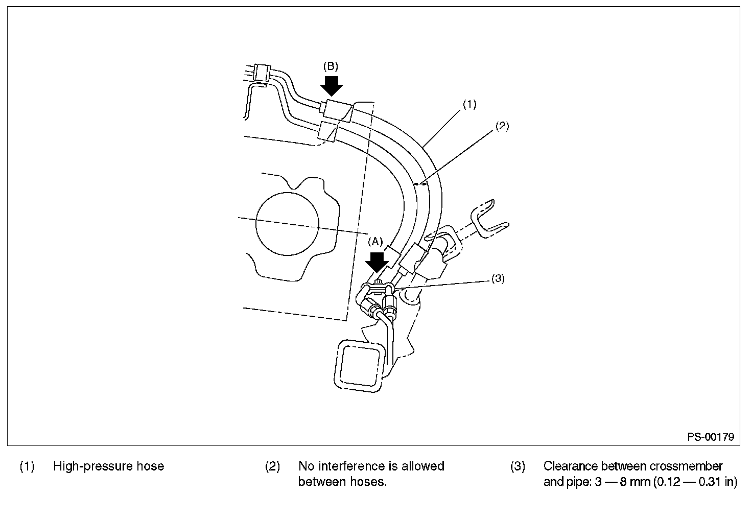 If the cruise control actuator and power steering hose clearance is less than 10 mm (0.39 in), move section (A) held in place by the clamp, or bend (B) to adjust.