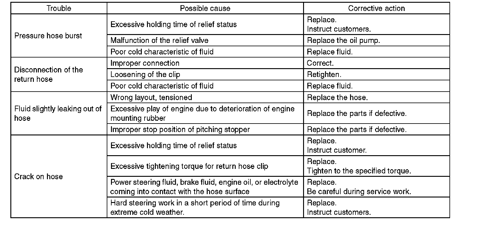Since resistances for heat and low temperature brittleness gradually declines according to long periods of exposure to hot or cold conditions, and their service lives are shortening accordingly. It is necessary to perform careful inspection frequently when the vehicle is used in hot weather areas, cold weather areas and in frequent driving conditions where a lot of steering work is required.