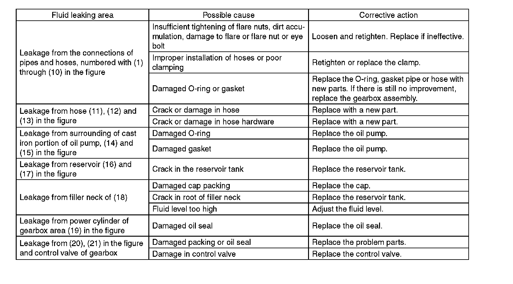NOTE: There are conditions in which a fluid leak is diagnosed, but is not actually leaking. This is because the fluid spilt during the last maintenance was not completely wiped off. Be sure to wipe off spilt fluid thoroughly after maintenance.