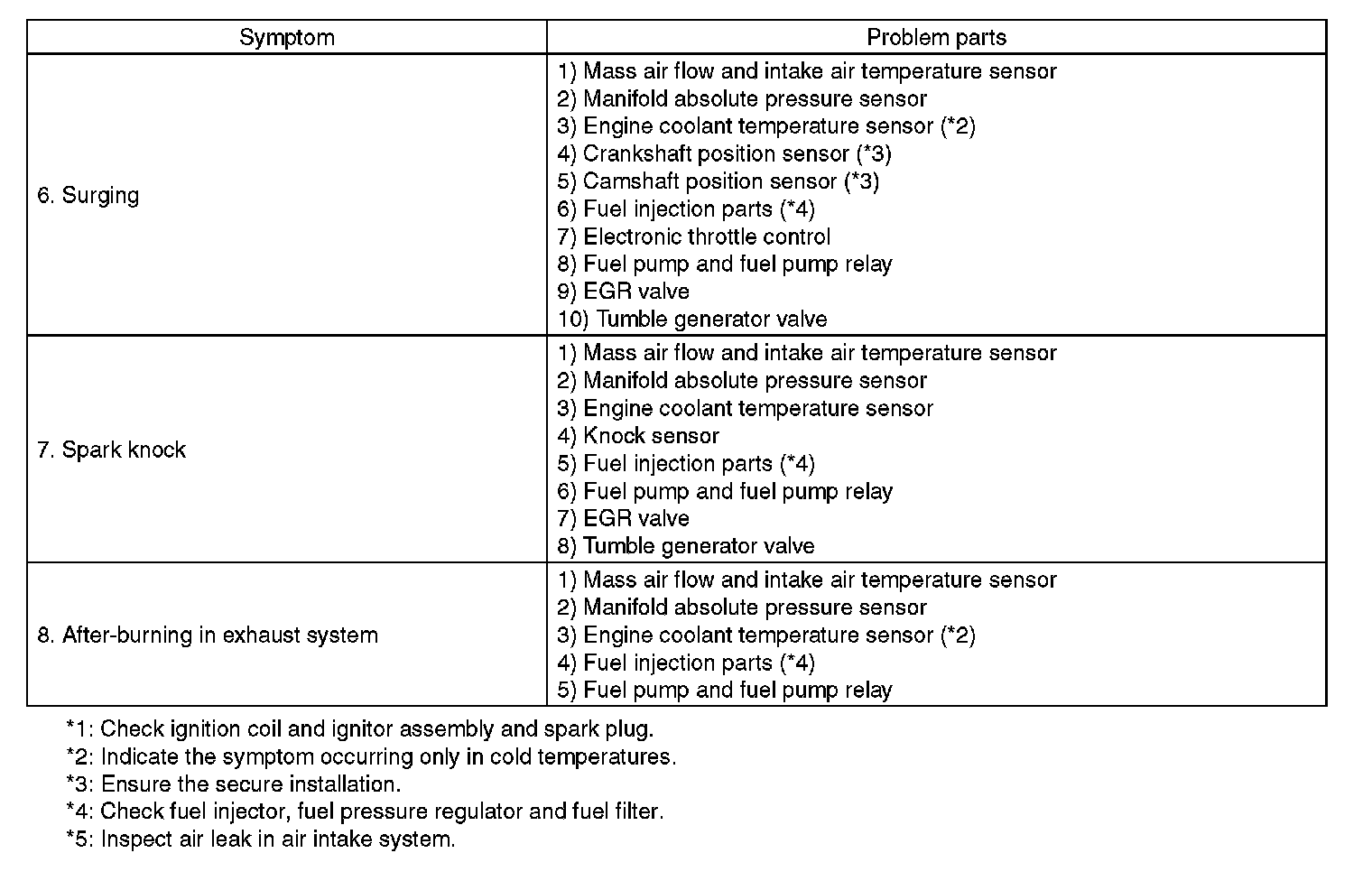 Malfunction of parts other than those listed is also possible.
