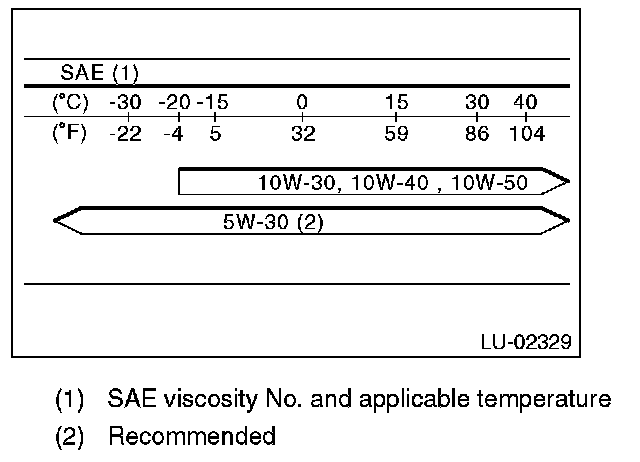 NOTE: Use an oil with the viscosity shown below if the vehicle is used in regions of high temperature, or in severe environments. API standard: SM or SL SAE viscosity No.: 30, 40, 10W-50, 20W-40, 20W50