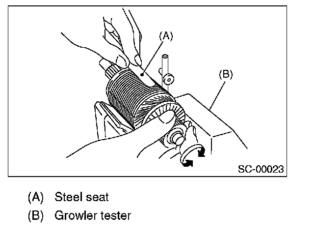 Place the armature on the growler tester to check for short circuits. While slowly turning the armature, support the steel seat for the armature core. If the circuits on the armature are shorted, the steel seat will vibrate, causing it to move to the core. When the steel seat has moved and vibrated, replace or repair the armature with the shorted circuit.