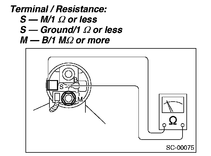 Using a circuit tester (set in Ohm), check that there is continuity between terminals S and M, and between terminal S and ground.
