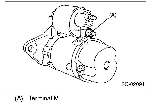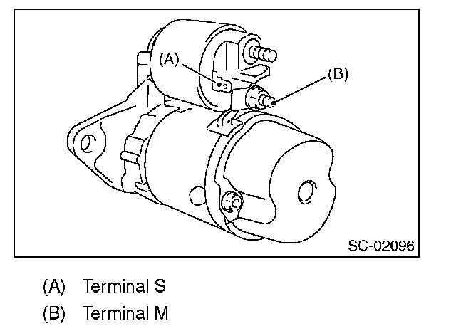 2. Disconnect the connector from terminal M. Then using a lead wire, connect the positive terminal of battery and terminal M and ground terminal to starter body.