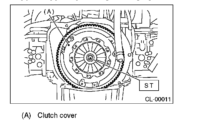 2) Install the clutch cover to the flywheel, and tighten the bolts to the specified torque.