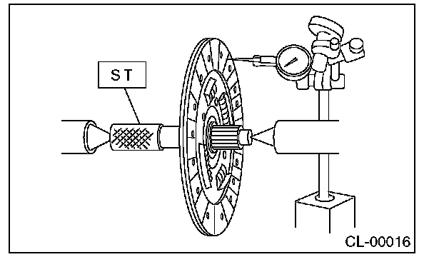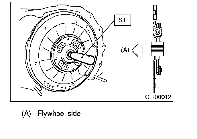 1) Insert the ST into the clutch disc and attach to the flywheel by inserting the ST end into pilot bearing.