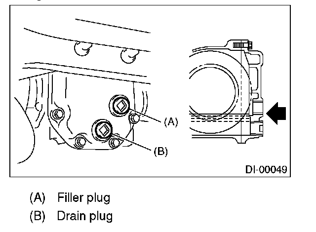2) Check that the gear oil level is up to the bottom of filler plug hole. If the level is low, check that there is no oil leakage and fill the oil up to the bottom of filler plug.