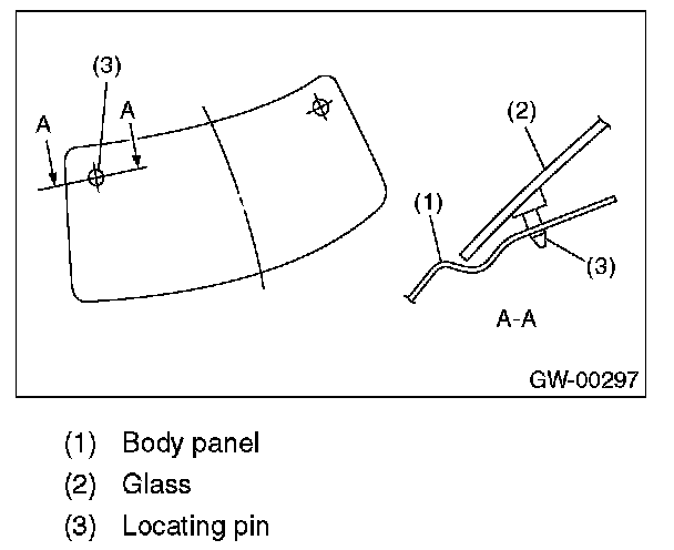 NOTE: The locating pin is adhered to the corner portion on the vehicle's indoor side of the glass. Use the piano wire to cut each pin.