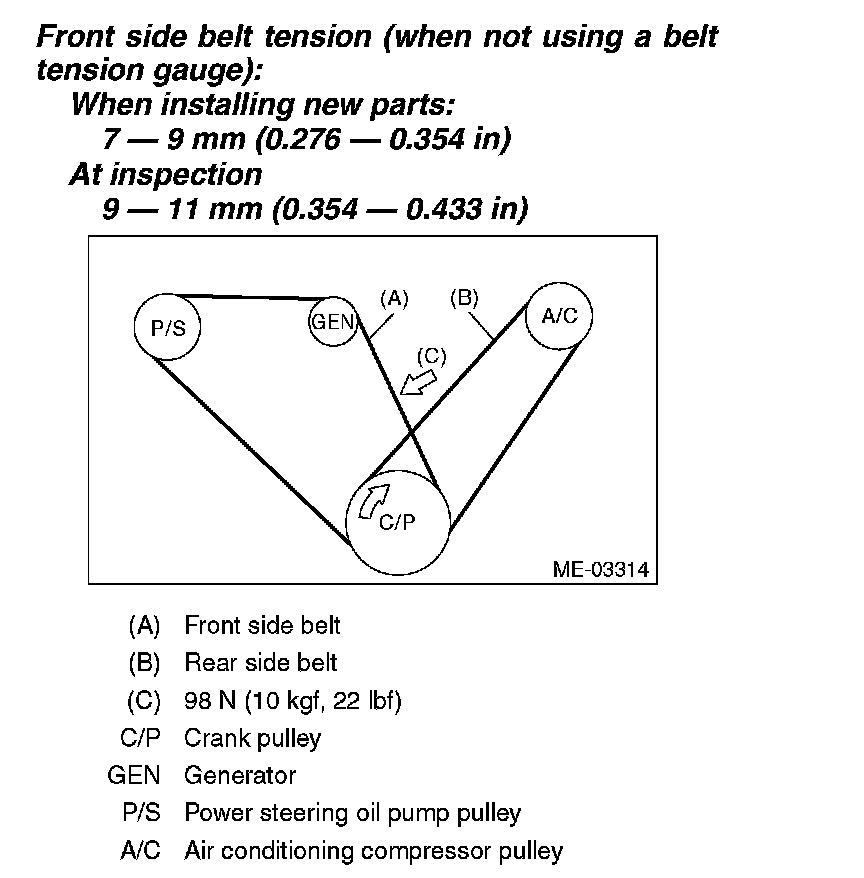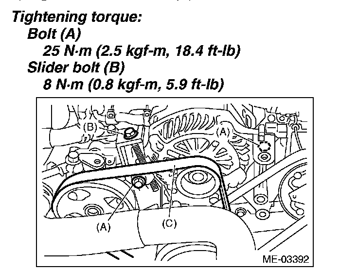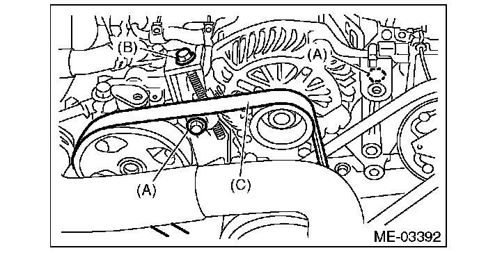 2) Install the front side belt (C), and adjust the slider bolt (B) so as to obtain the specified belt tension.
