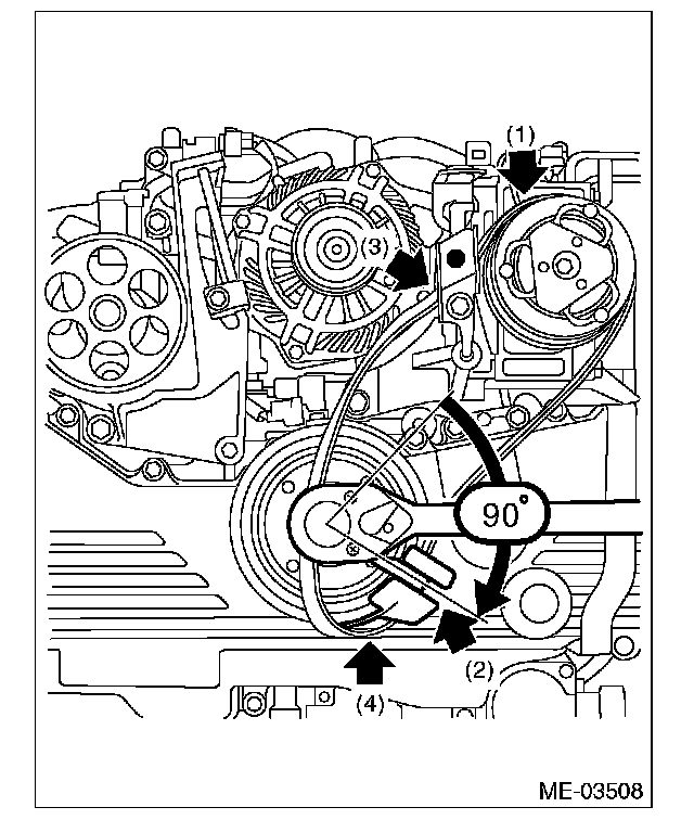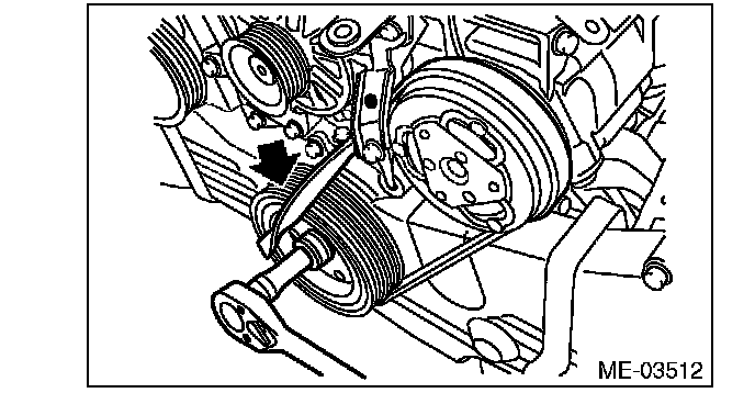 16) Make sure that the belt ribs are properly riding on the grooves of the pulleys, and turn the crank pulley slowly to the right twice to break in the rear side belt.