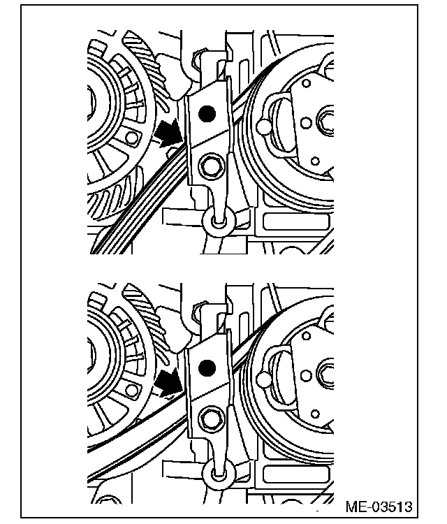 12) While checking for the following, turn the crank pulley slowly to the right by approximately 90 degrees and set the belt guide to the position shown in the figure.