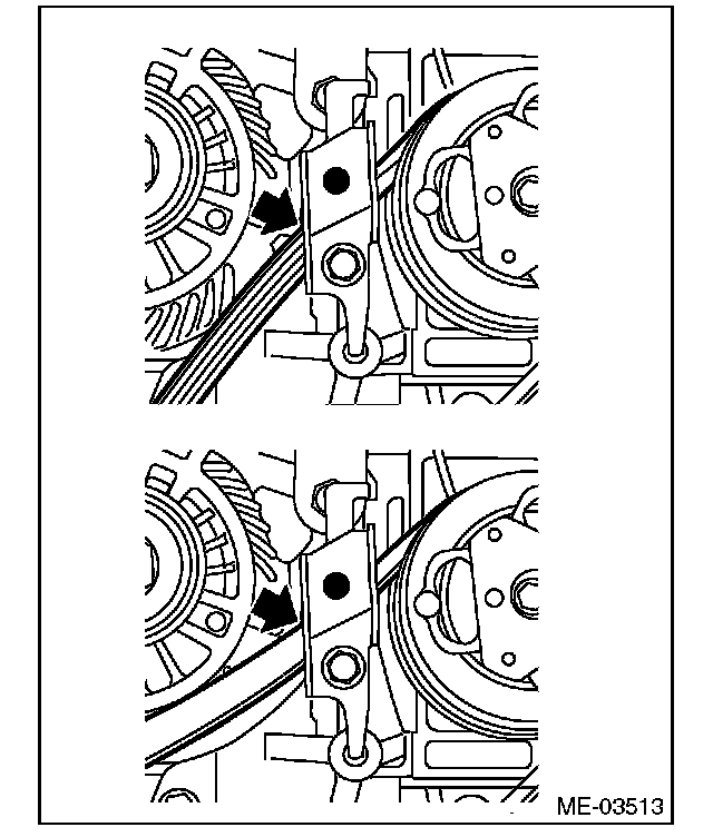 (2) The ribs of the rear side belt are properly riding on the grooves of the A/C compressor pulley.