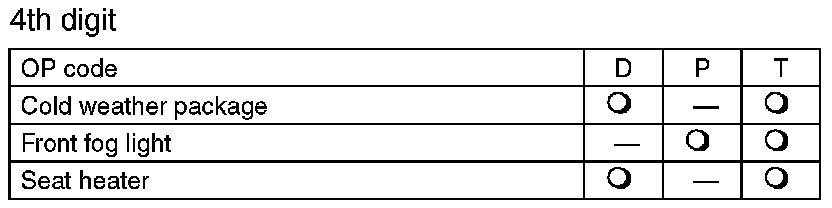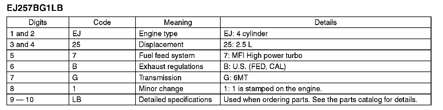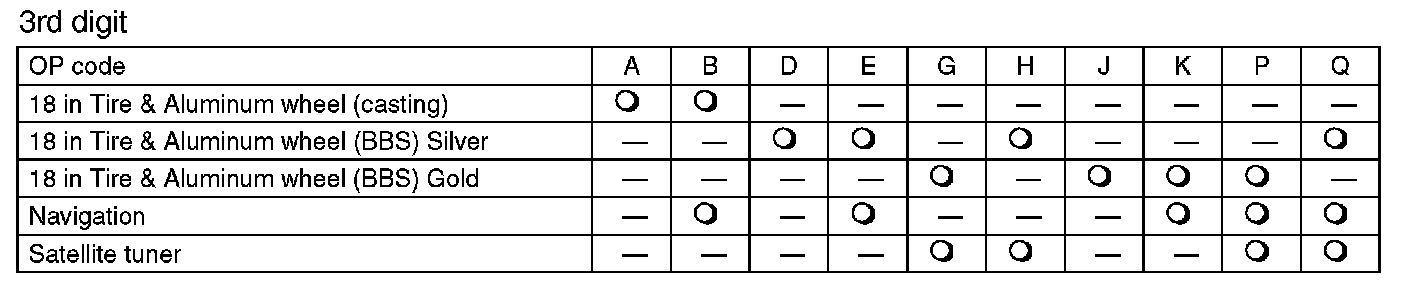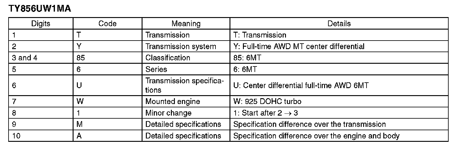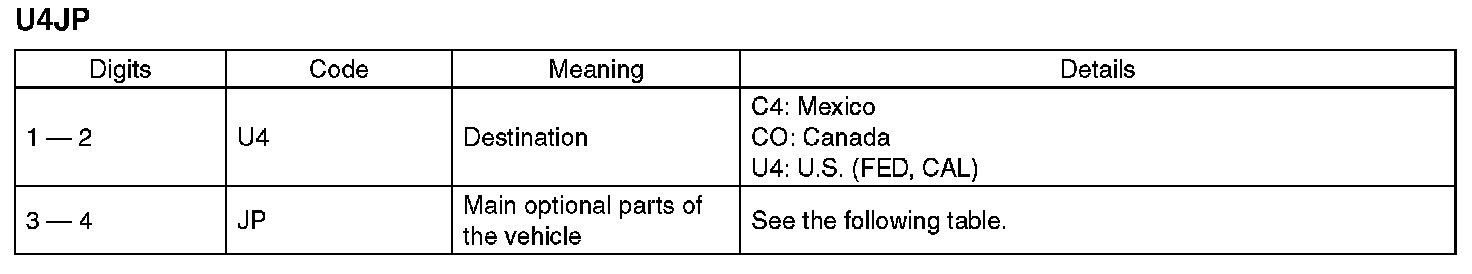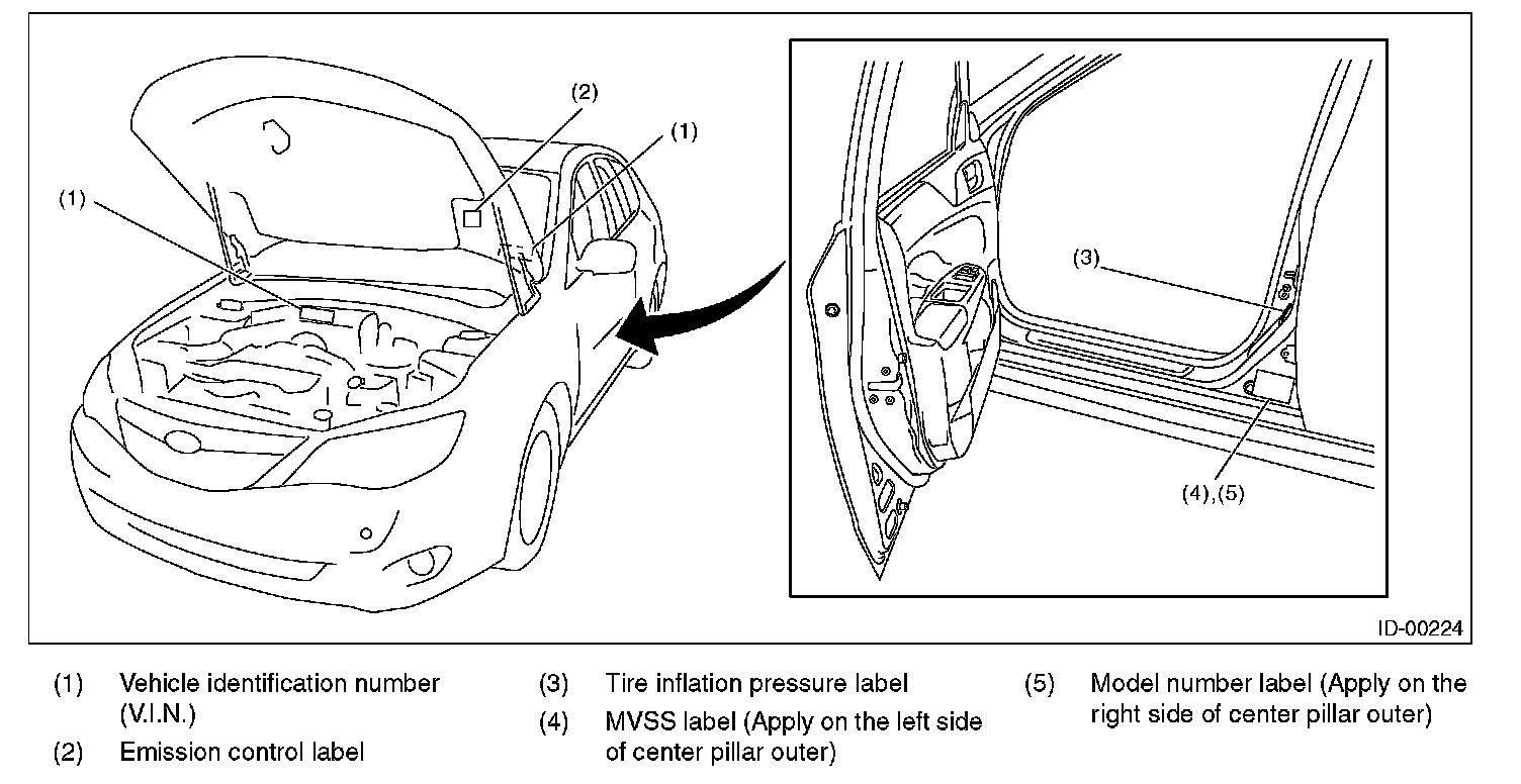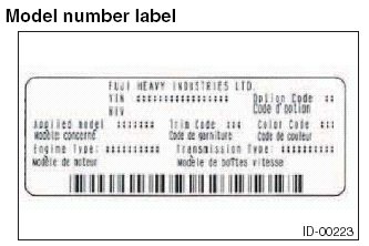 The model number label indicates: the applied model, the option code, the trim code, the engine type, the transmission type, and the exterior color code. This information is helpful when placing orders for parts.