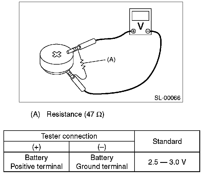 Measure the voltage between the keyless transmitter battery (+) terminal and (-) terminal.