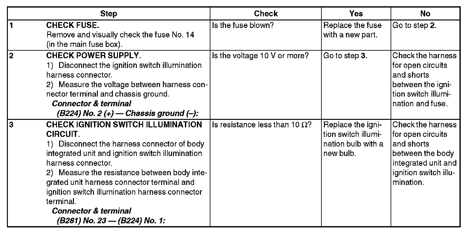 11. CHECK IGNITION SWITCH ILLUMINATION