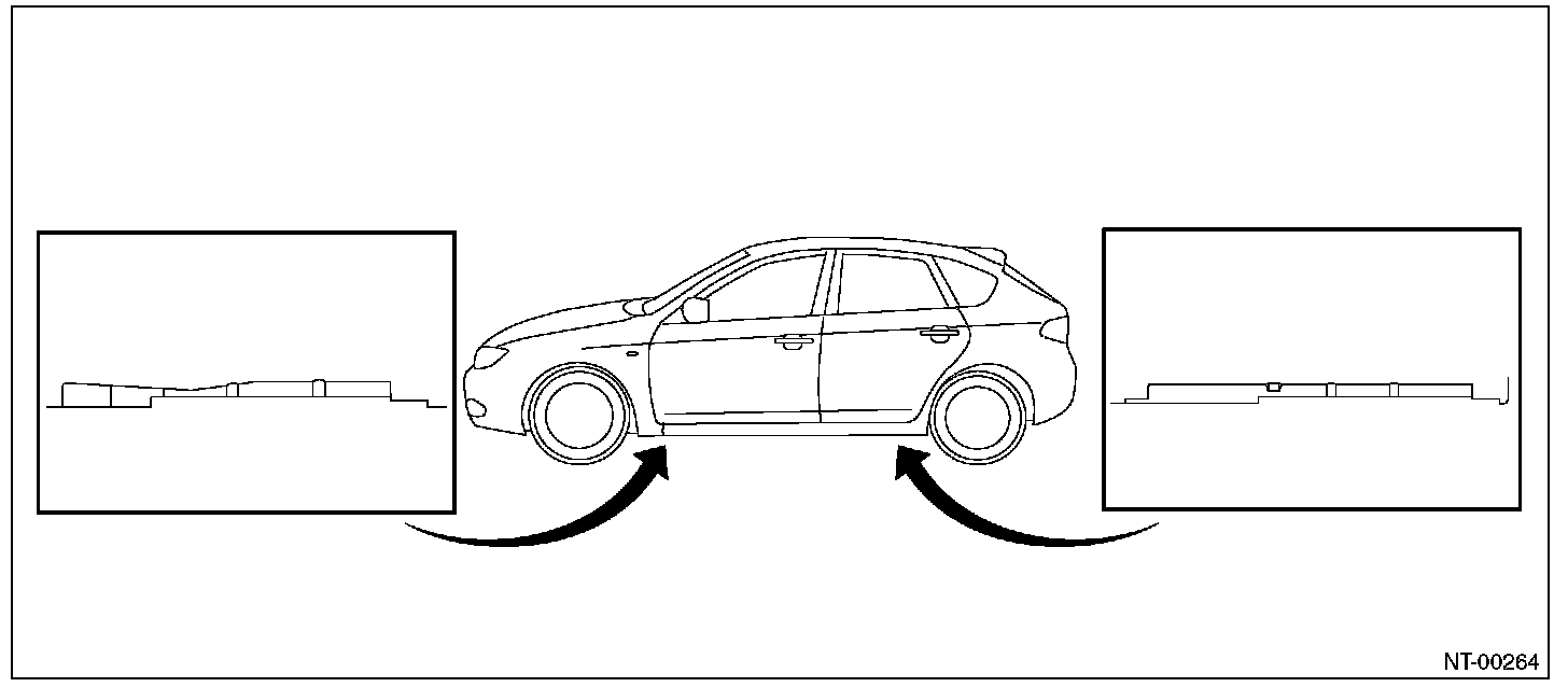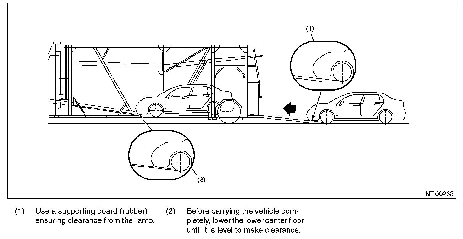 - When carrying the vehicle onto a car carrier truck, perform the operation being careful with the gap between the height of the carrier's floor and the vehicle lower side because of little clearance under the front bumper.
