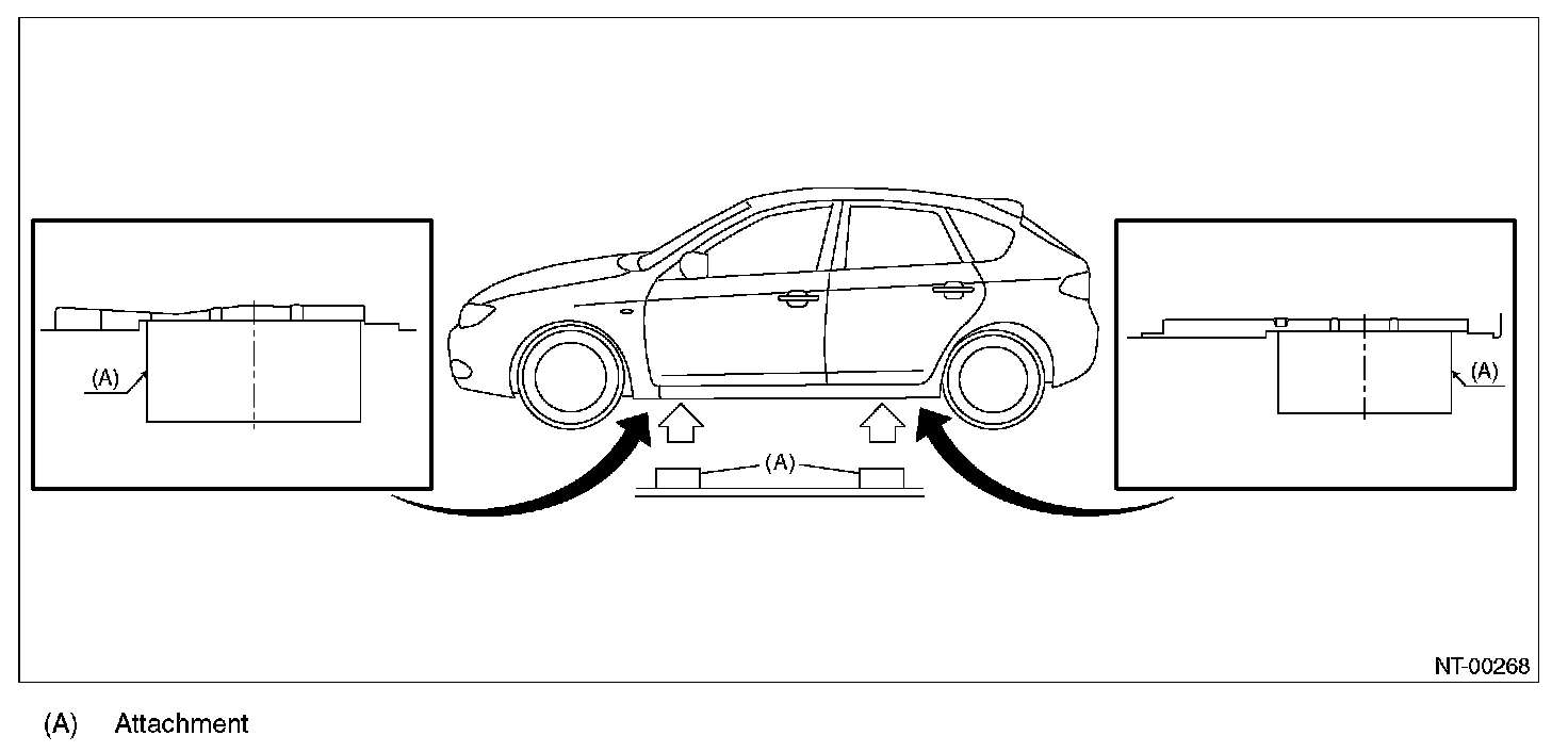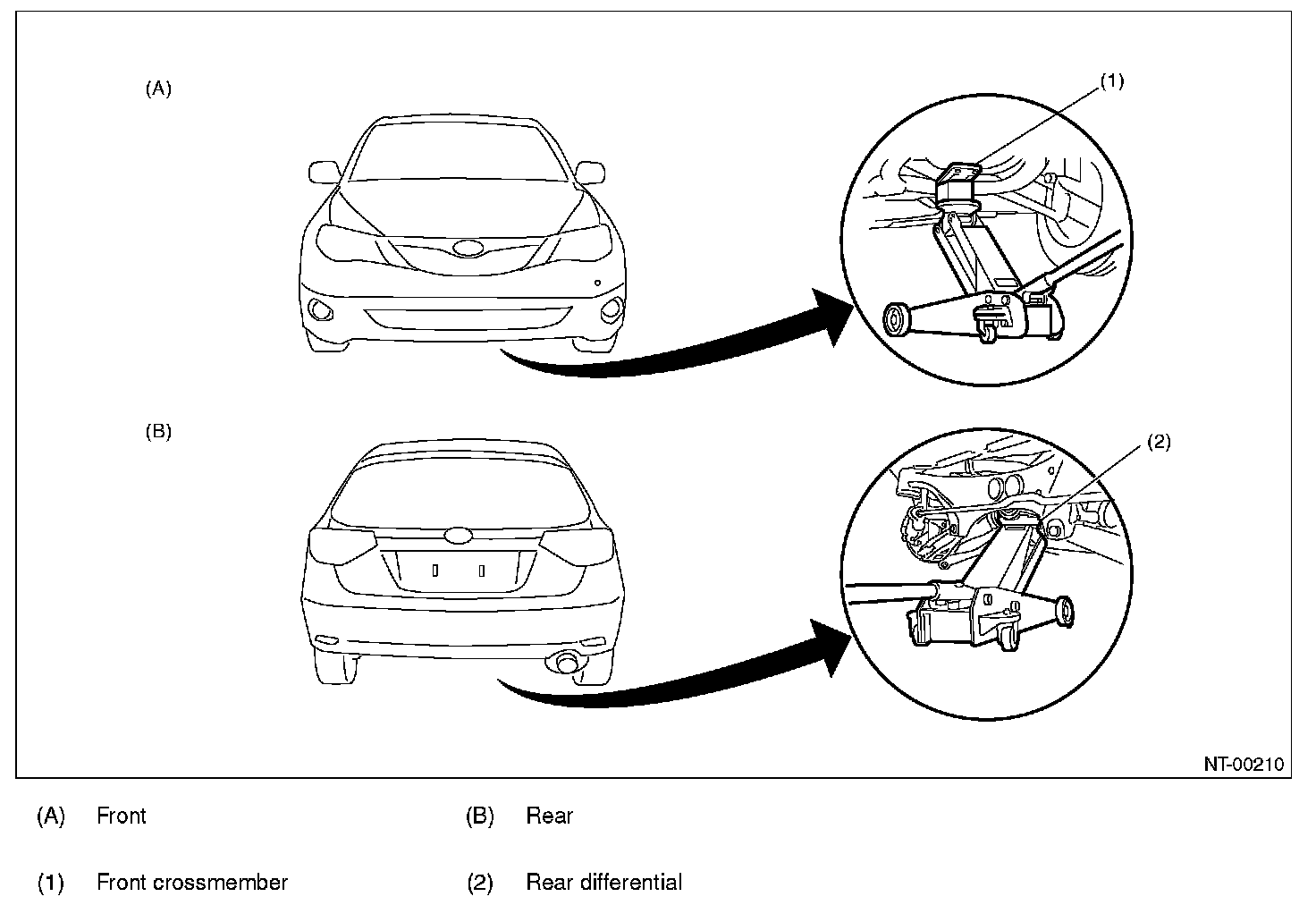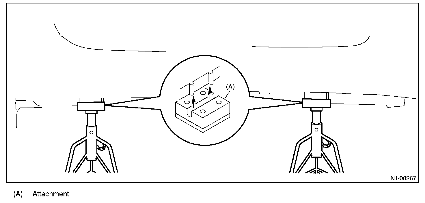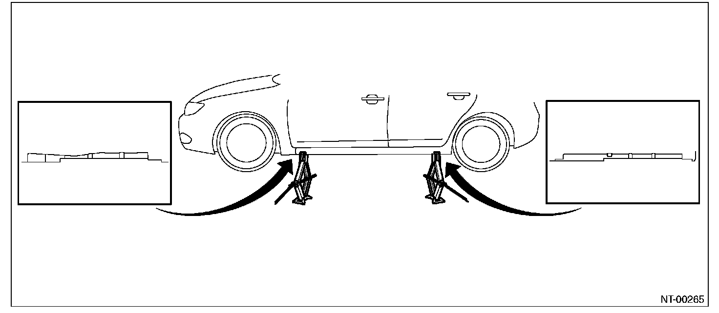 When using a lift or shop jack to raise a vehicle or using rigid rack to support a vehicle, always follow instructions concerning jack-up points and weight limits to prevent the vehicle from falling, which could result in injury. Be especially careful that the vehicle is balanced before raising it. Be sure to set the wheel stoppers when jacking-up only the front or rear side of the vehicle.