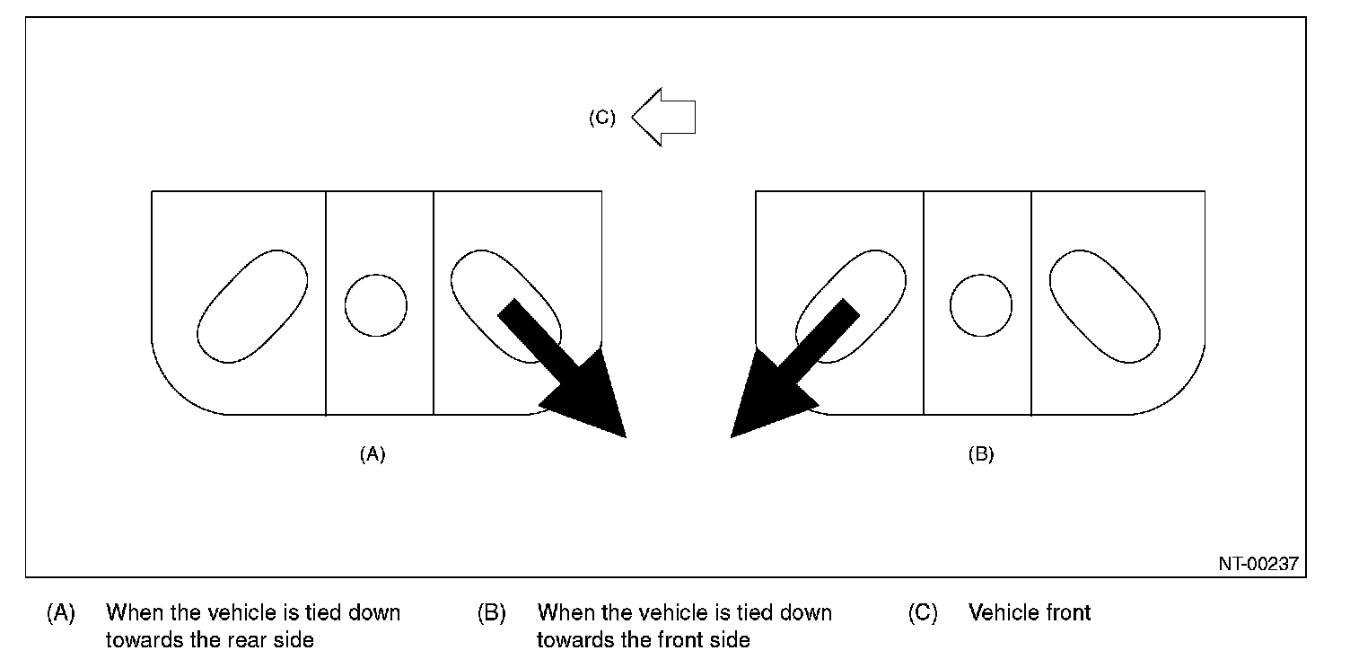 When the vehicle is tied down from the rear side, use the holes at the rear side, and when the vehicle is tied down from the front side, use the holes at the front side.