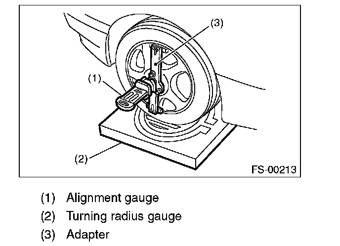 1) Place the front wheel on the turning radius gauge. Make sure the ground contact surfaces of the front and rear wheels are at the same height.