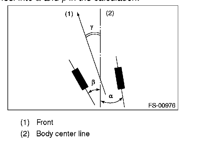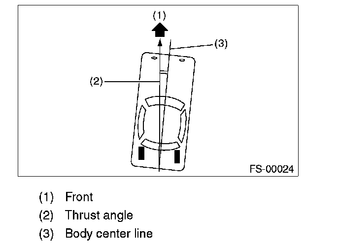 NOTE: Thrust angle is a mean value of left and right wheel toe angles in relation to the vehicle body center line. Vehicle is driven straight in the thrust angle direction while slanting in the oblique direction depending on the degree of the mean thrust angle.