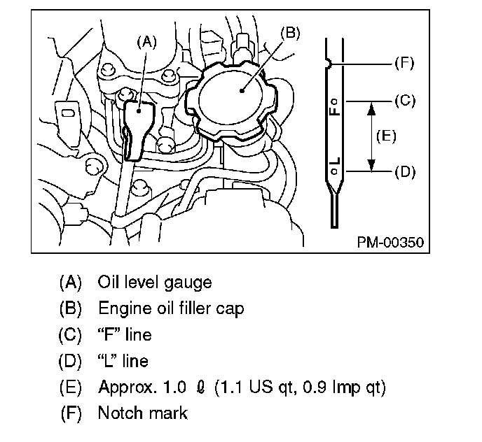 7) Using engine oil of proper quality and viscosity, fill engine oil through the oil filler duct to the "F" line on oil level gauge. Make sure that the vehicle is parked on a level surface when checking oil level.