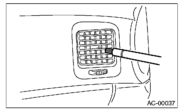 11. Turn the ignition key to the ON position, and run the blower at high speed for approx. 1 minute. Stop the blower and check the ventilation grille on the instrument panel. While moving the tester closer to the grille, run the blower for 1 or 2 seconds, then stop it. Check the grille at that position for at least 10 seconds.