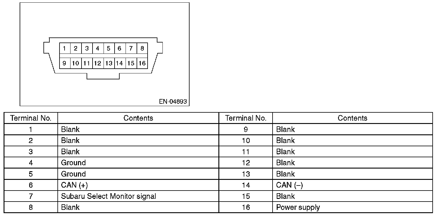 CAUTION: Do not connect any scan tools except Subaru Select Monitor or general scan tool because the circuit for Subaru Select Monitor may be damaged.