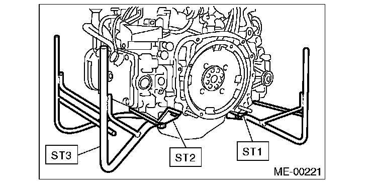 1) After removing the engine from body, secure it to ST in the following procedure.