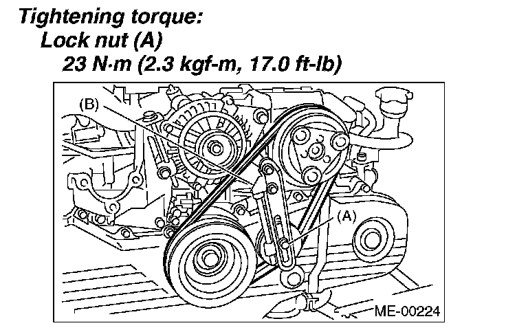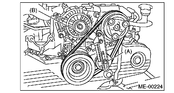 2) Install the rear side belt, and tighten the slider bolt (B) so as to obtain the specified belt tension.