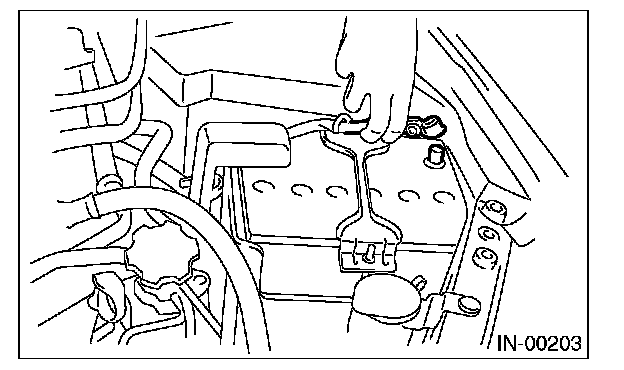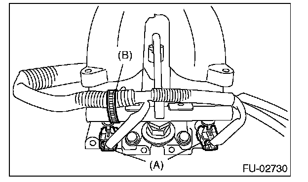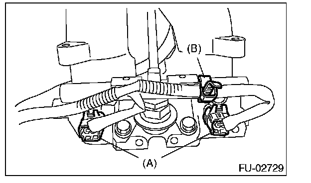 7. Remove the harness band (B) which holds the engine harness to injector pipe.