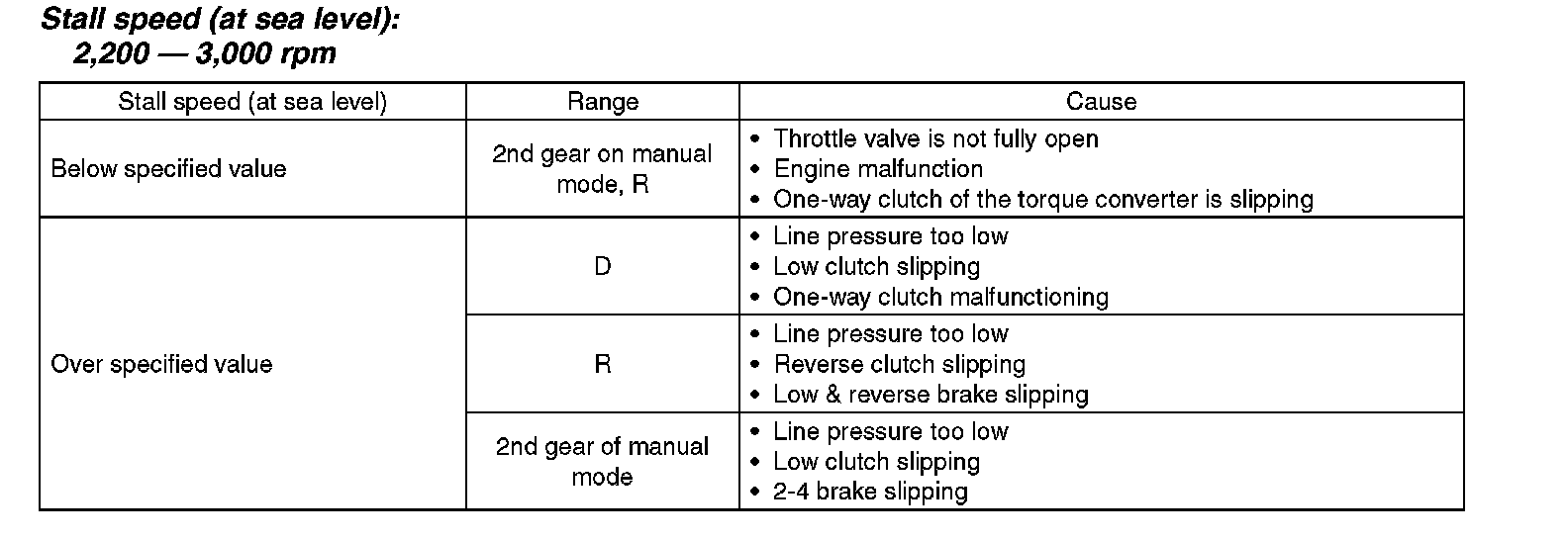 ^ If the stall speed is higher than the specified range, attempt to finish the stall test in as short a time as possible, in order to prevent the automatic transmission from sustaining damage.