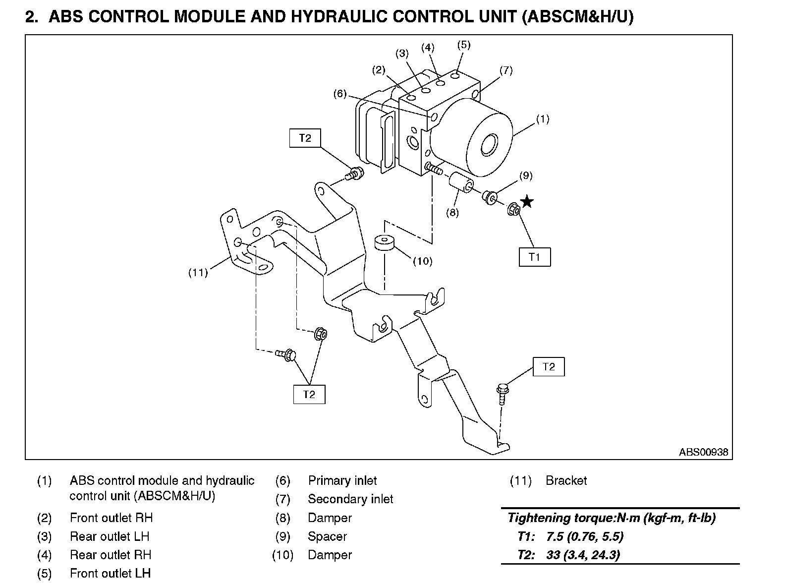 2) Align the damper groove of the ABSCM & H/U to the bracket side claw, and install the ABSCM & H/U with new nuts (023506000).