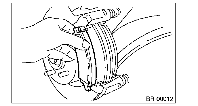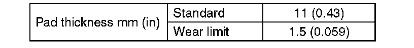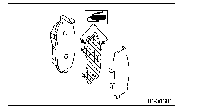 ^ A wear indicator is installed on the inner disc brake pad. If the pad is worn to the limit, the end of wear indicator contacts disc rotor, and a squeaking sound is heard as the wheel rotates. If the sound is heard, replace the pad.
