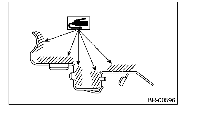 1) Apply a thin coat of Molykote M7439 (Part No. K0770YA000) or grease contained in the pad kit to the pad clip.