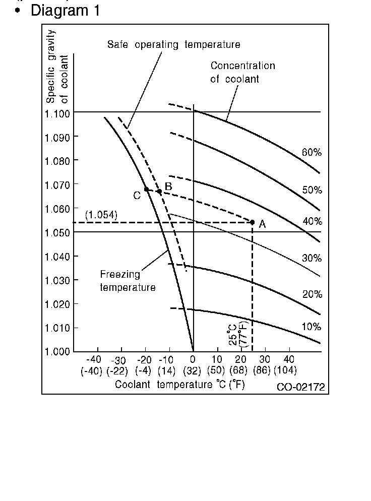 If the coolant temperature is 250C (77°F) and its specific gravity is 1.054, the concentration is 35% (point A), the safe operating temperature is -14°C (7°F) (point B), and the freezing temperature is -20°C (-4°F) (point C).