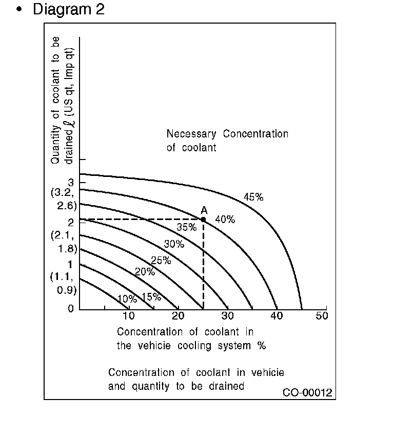 Assume that the engine coolant concentration must be increased from 25% to 40%. Find point A, where the 25% line of engine coolant concentration intersects with the 40% curve of the necessary engine coolant concentration, and read the scale on the vertical axis of the graph at height A. The quantity of coolant to be drained is 2.1 l (2.2 US qt, 1.8 Imp qt). Drain 2.1 l (2.2 US qt, 1.8 Imp qt) of coolant from the cooling system and add 2.1 l (2.2 US qt, 1.8 Imp qt) undiluted engine coolant solution.