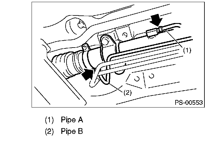 3) Remove the one pipe joint at the center of the gearbox, and connect the vinyl hose to the pipe and the joint. Discharge the fluid by turning the steering wheel fully clockwise and counterclockwise. Discharge the fluid similarly from other pipes.