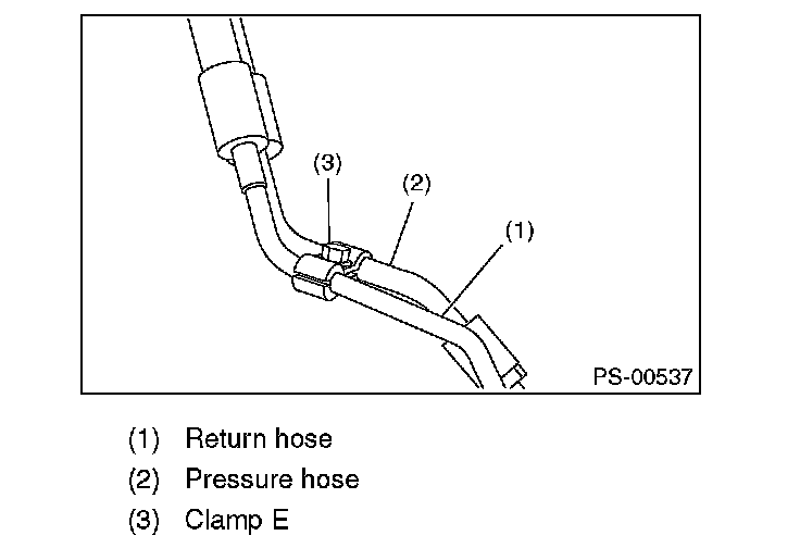 4) Remove the clamp E from return hose and pressure hose.