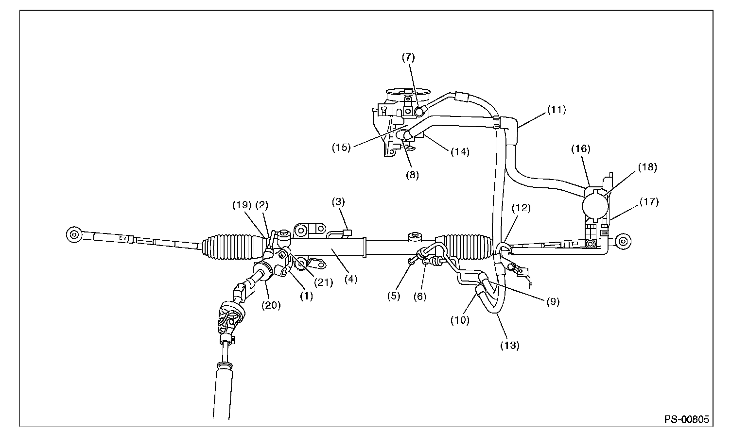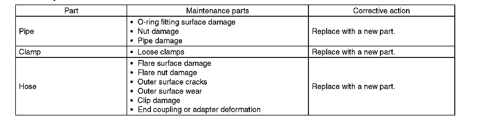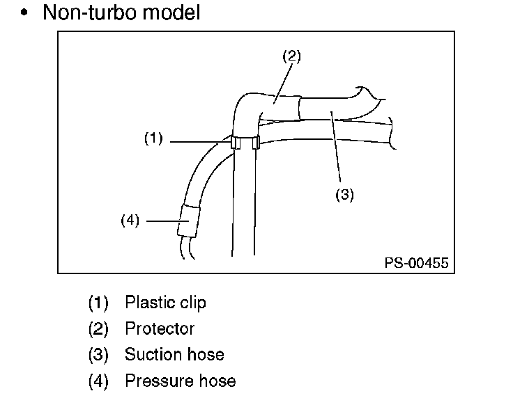 Although the surface layer materials of rubber hoses have excellent weathering resistance, heat resistance and resistance for low temperature brittleness, they are likely to be damaged chemically by brake fluid, battery electrolyte, engine oil and automatic transmission fluid and their service lives are to be very shortened. Wipe off hoses immediately if any of these come into contact with the hoses. Since resistances for heat or low temperature brittleness are gradually declining according to time accumulation of hot or cold conditions for the hoses and their service lives are shortening accordingly, it is necessary to perform careful inspection frequently when the vehicle is used in hot weather areas, cold weather areas and a driving condition in which many steering operations are required in short time.