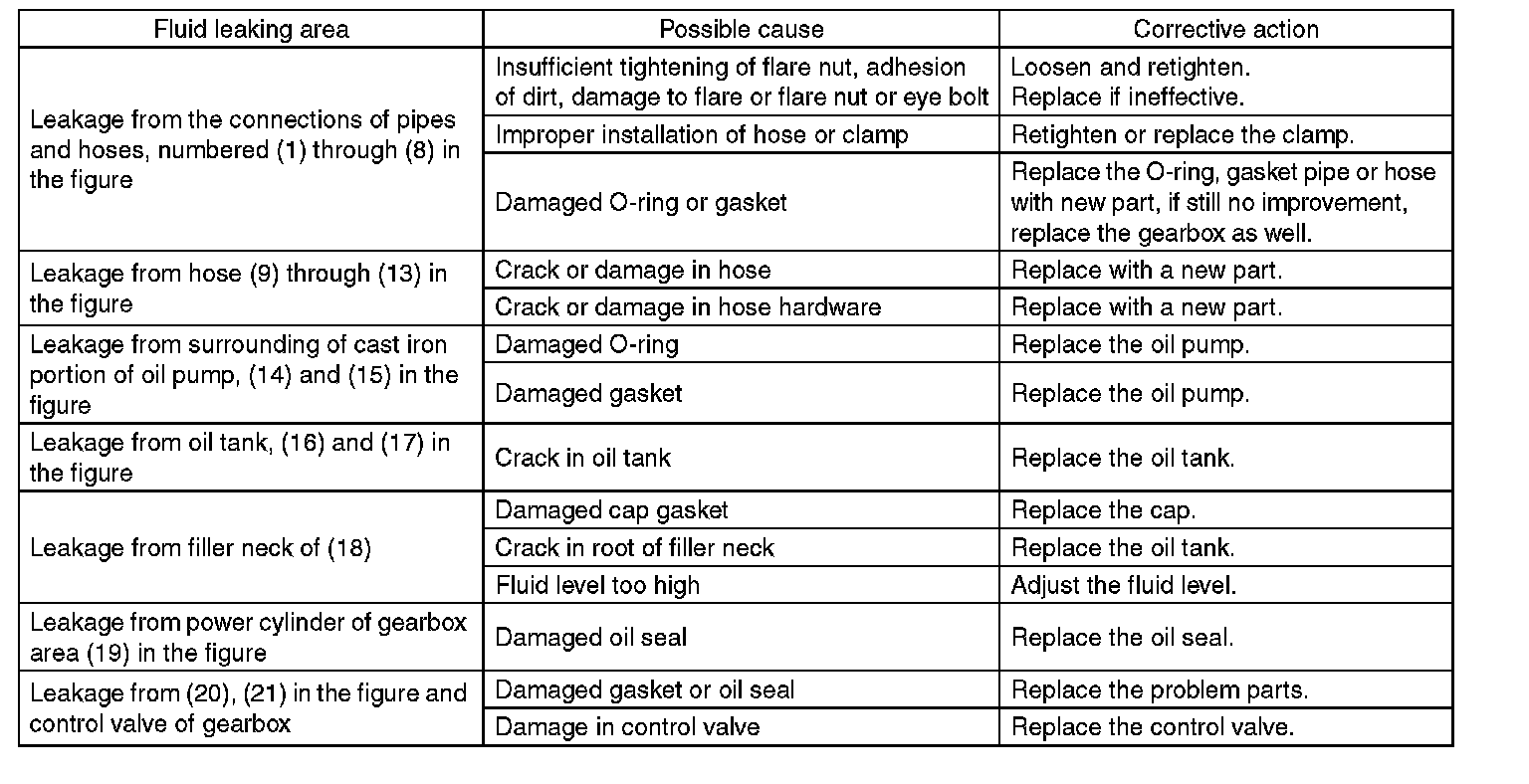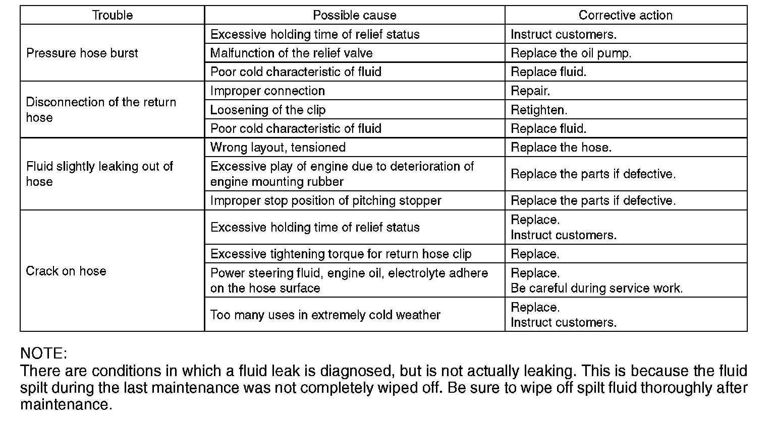 There are conditions in which a fluid leak is diagnosed, but is not actually leaking. This is because the fluid spilt during the last maintenance was not completely wiped off. Be sure to wipe off spilt fluid thoroughly after maintenance.