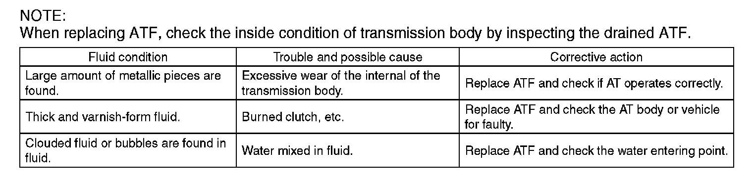 When replacing ATF, check the inside condition of transmission body by inspecting the drained ATF.