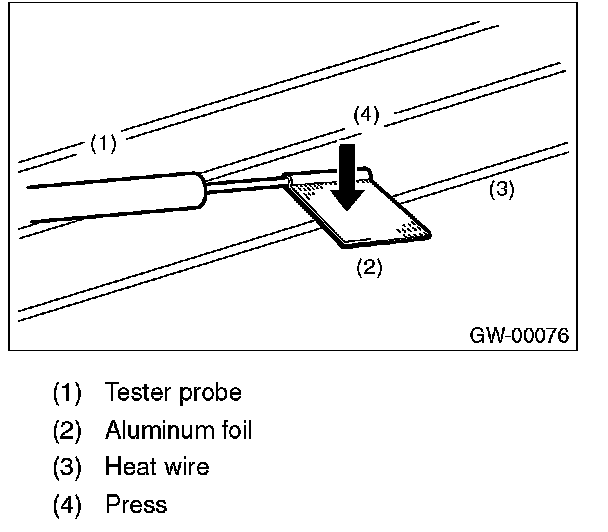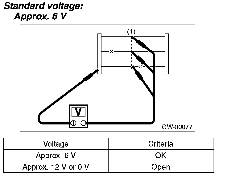 - If the measured value is 12 V, heat wire is open between heat wire center and positive (+) terminal of tester probe.