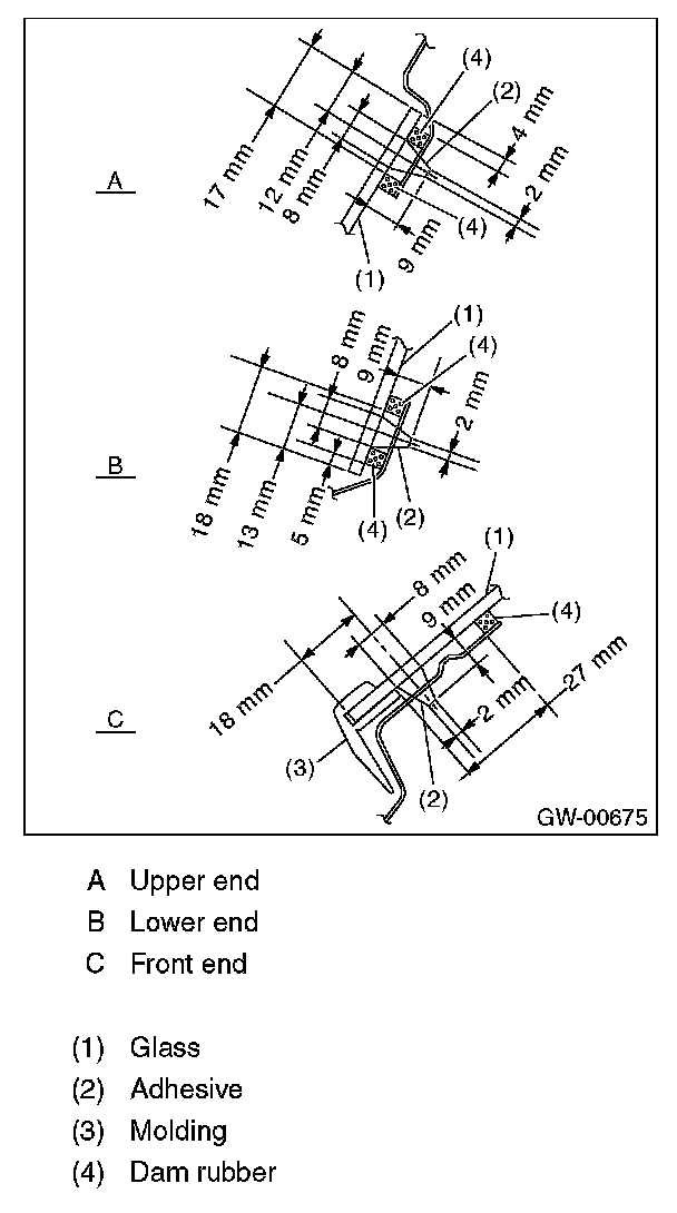 - For minimum drying time and vehicle standing time before driving after bonding, follow instructions or instruction manual from the adhesive manufacturer.